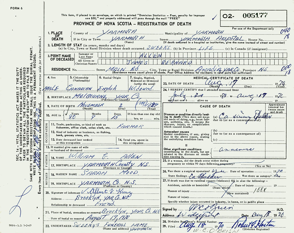 PROVINCE OF NOVA SCOTIA — REGISTRATION OF DEATH