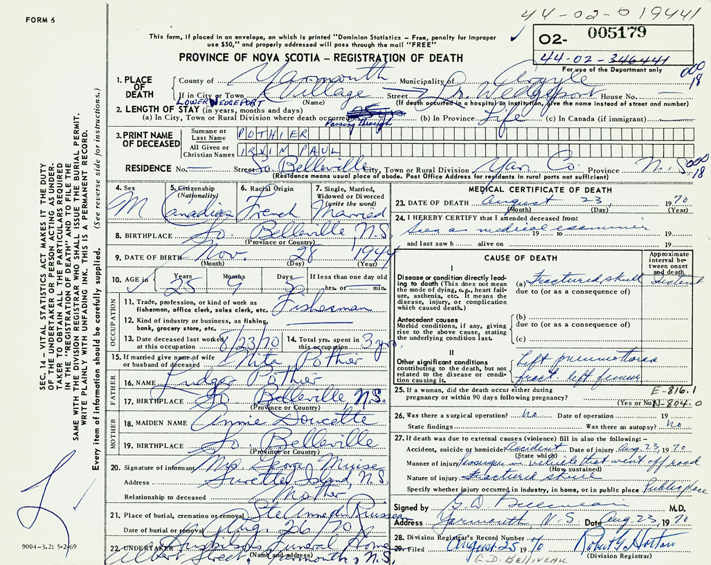 1. PLACE OF DEATH County of Yarmouth If in City or Town Lower Wedgeport