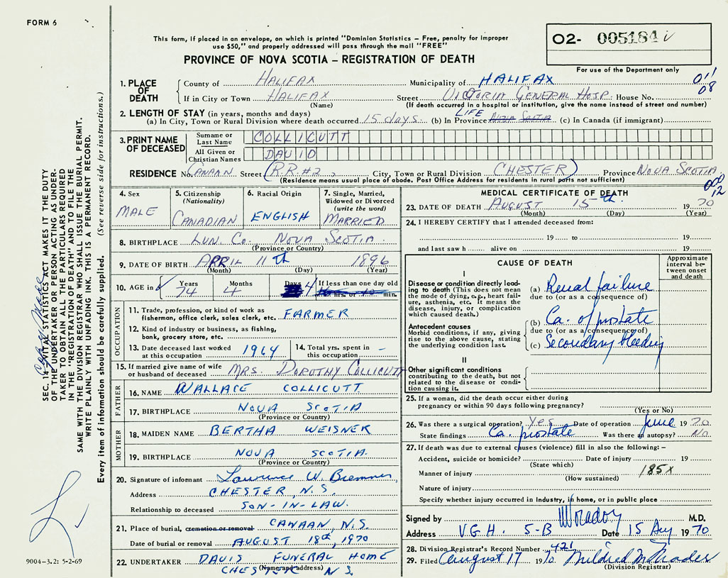 PROVINCE OF NOVA SCOTIA — REGISTRATION OF DEATH