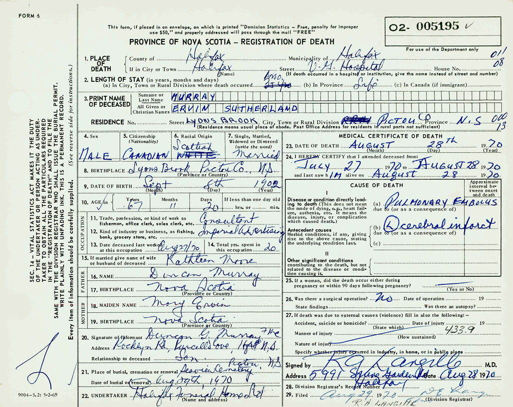 PROVINCE OF NOVA SCOTIA — REGISTRATION OF DEATH