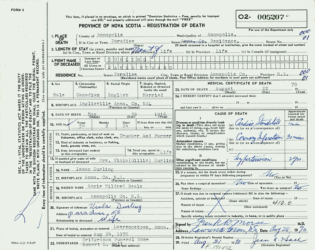 PROVINCE OF NOVA SCOTIA — REGISTRATION OF DEATH