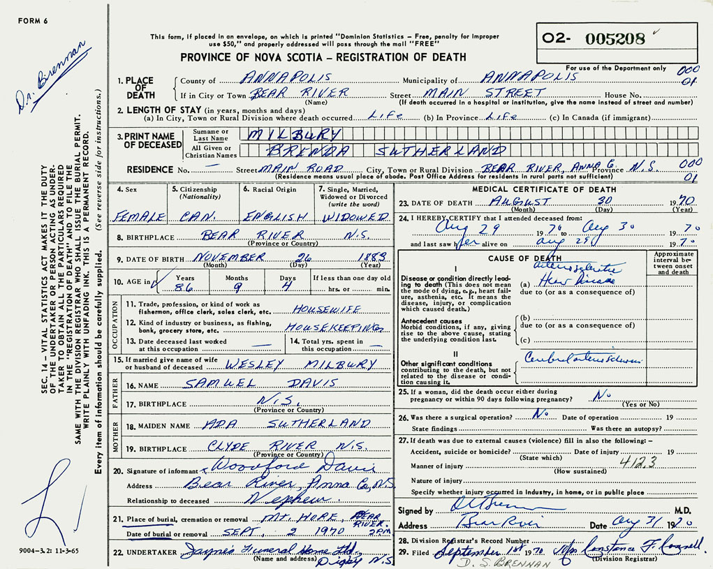 1. PLACE OF DEATH County of Annapolis If in City or Town Bear River