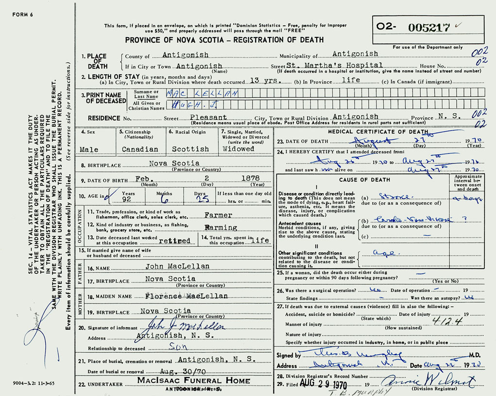PROVINCE OF NOVA SCOTIA — REGISTRATION OF DEATH