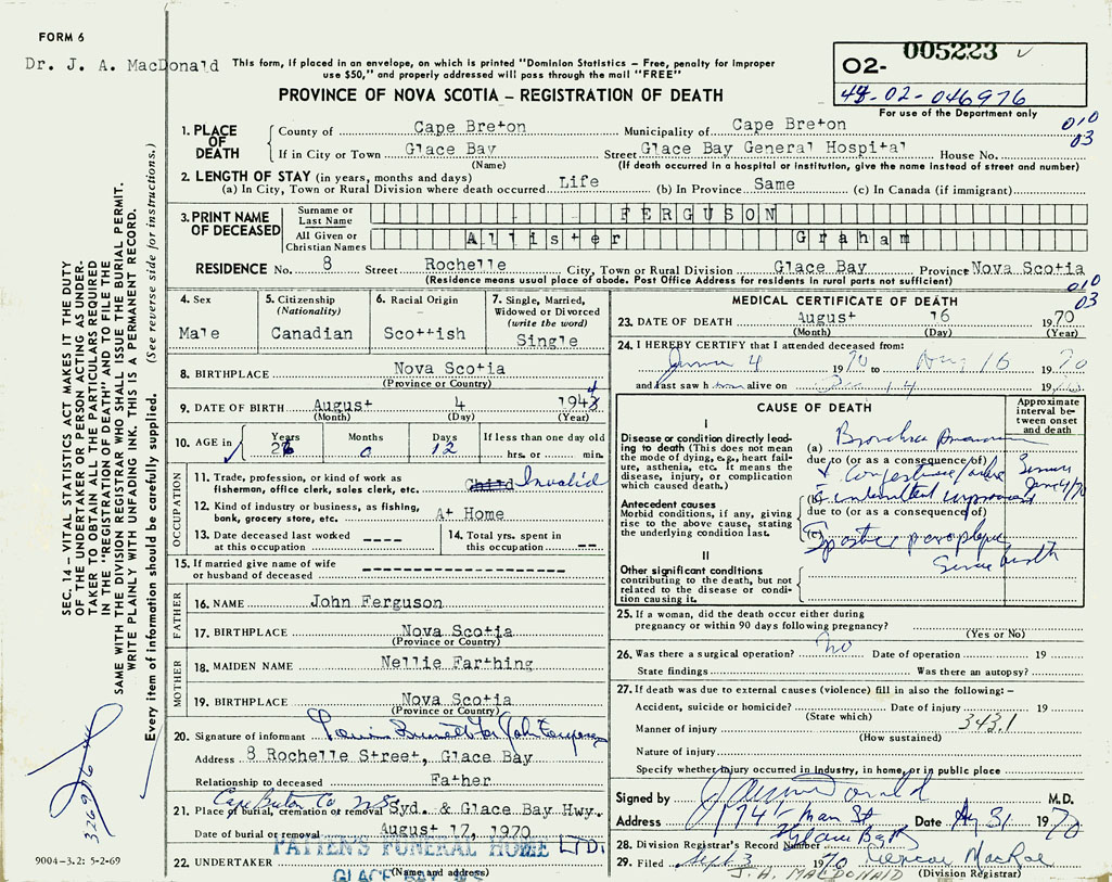 1. PLACE OF DEATH County of Cape Breton If in City or Town Glace Bay