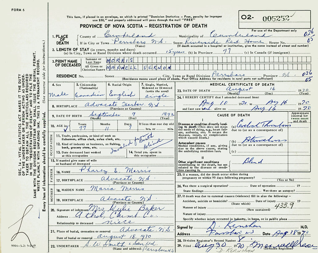 PROVINCE OF NOVA SCOTIA — REGISTRATION OF DEATH