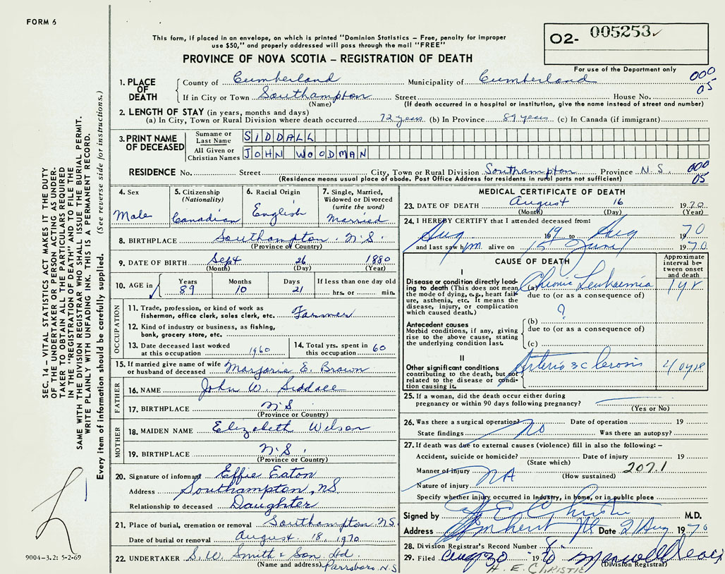 PROVINCE OF NOVA SCOTIA — REGISTRATION OF DEATH