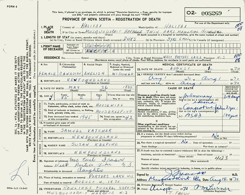 1. PLACE OF DEATH County of Halifax If in City or Town Musquodobit Harbour