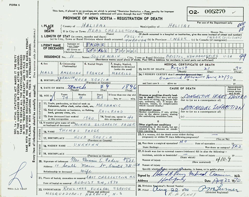 1. PLACE OF DEATH County of Halifax If in City or Town Head of Chezzetcook