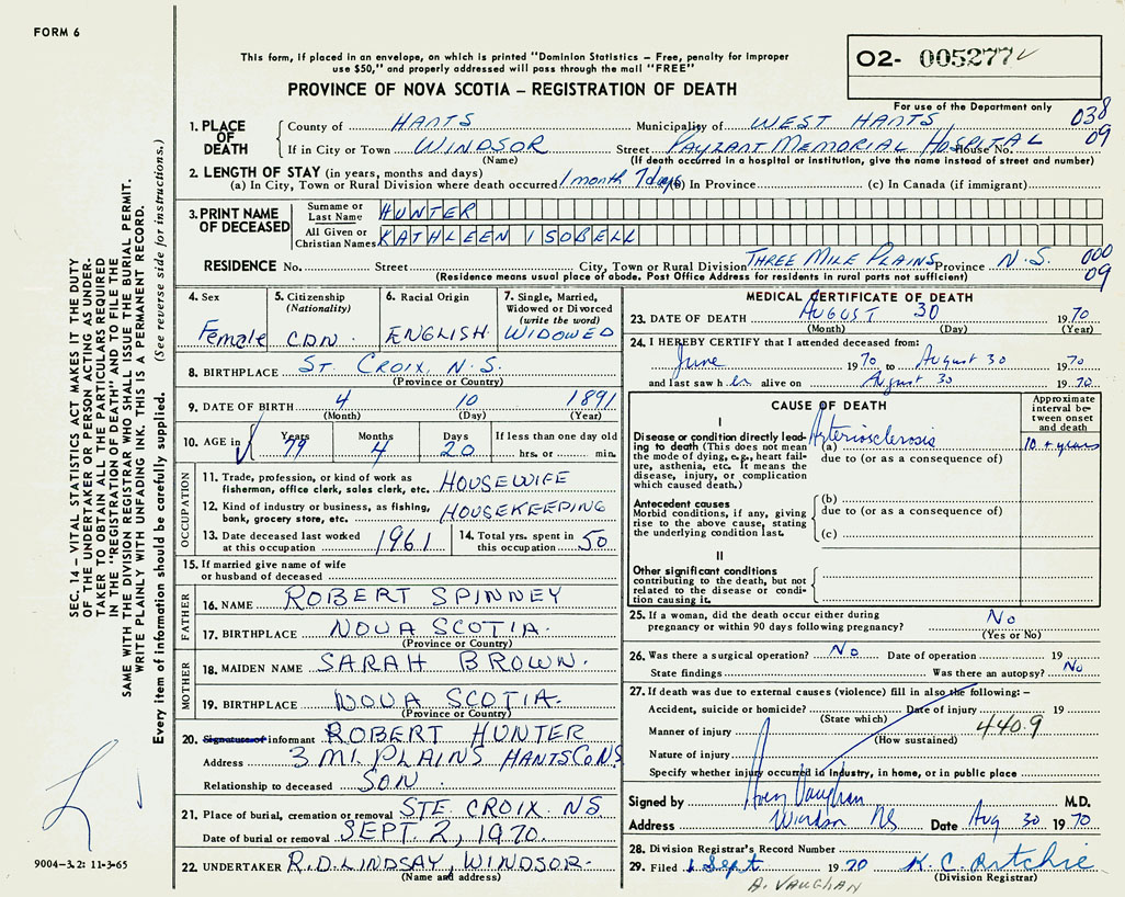 PROVINCE OF NOVA SCOTIA — REGISTRATION OF DEATH