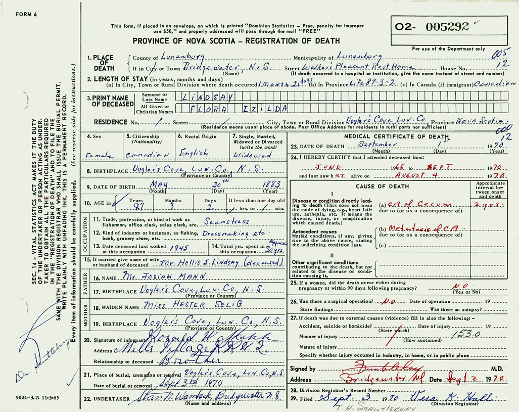 PROVINCE OF NOVA SCOTIA — REGISTRATION OF DEATH