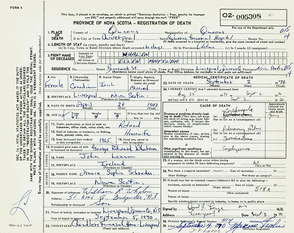 PROVINCE OF NOVA SCOTIA — REGISTRATION OF DEATH
