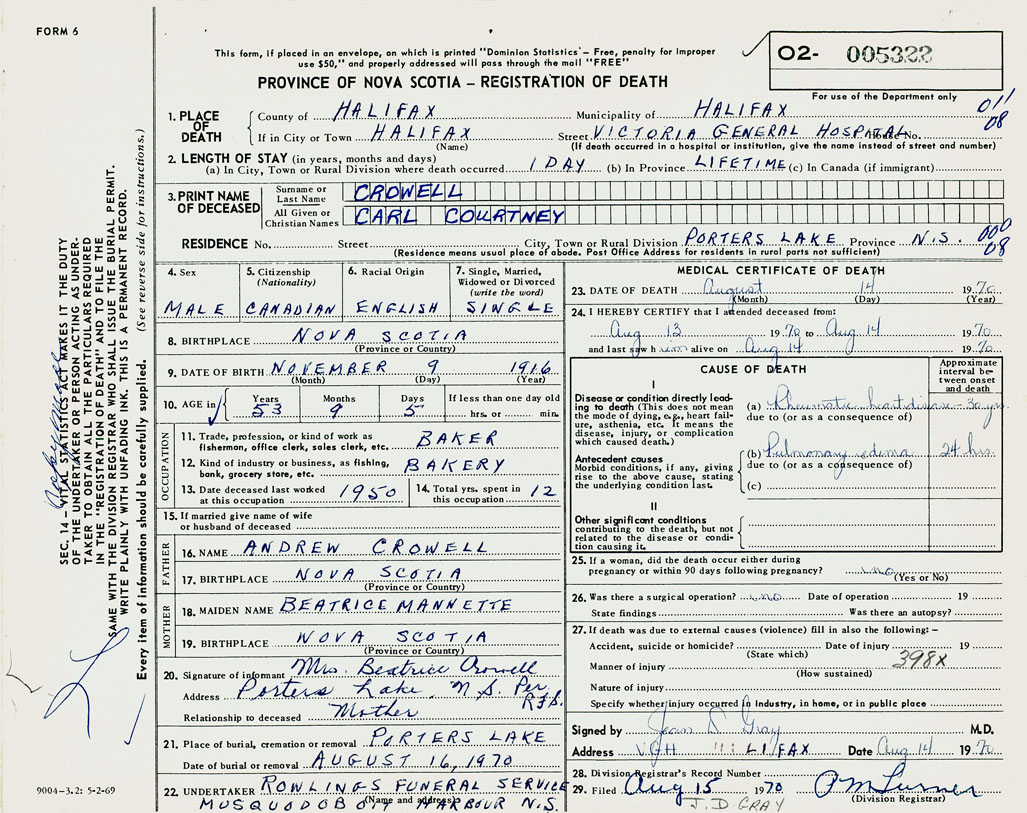 PROVINCE OF NOVA SCOTIA — REGISTRATION OF DEATH