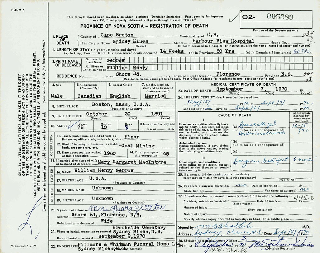 22. Undertaker Fillmore & Whitman Funeral Home Ltd., Sydney Mines