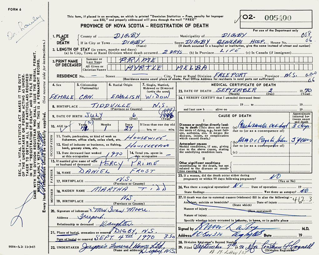 PROVINCE OF NOVA SCOTIA — REGISTRATION OF DEATH