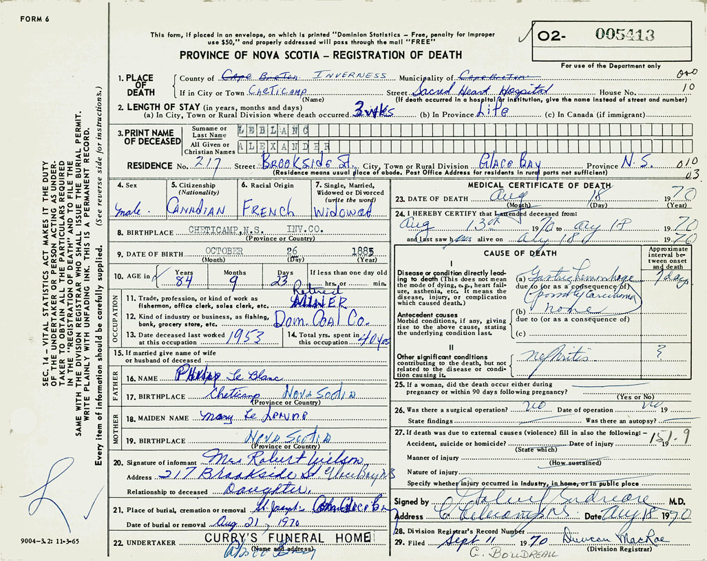 21. Place of burial St. Joseph's Cemetery, Glace Bay
