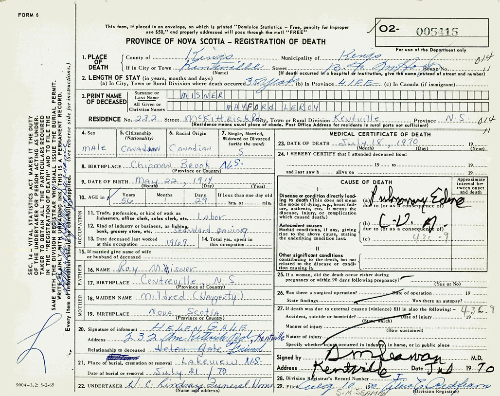 PROVINCE OF NOVA SCOTIA — REGISTRATION OF DEATH