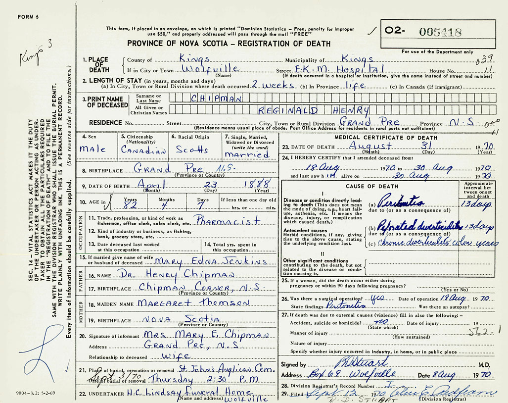 PROVINCE OF NOVA SCOTIA — REGISTRATION OF DEATH