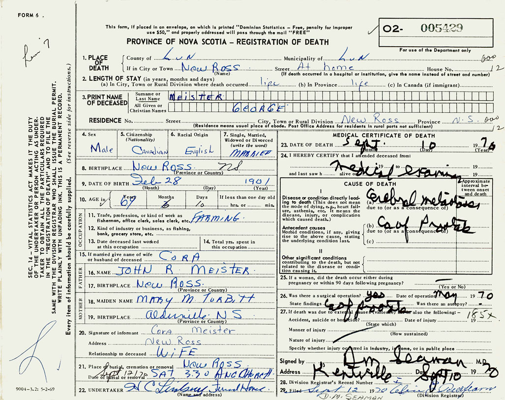 1. PLACE OF DEATH County of Lunenburg If in City or Town New Ross