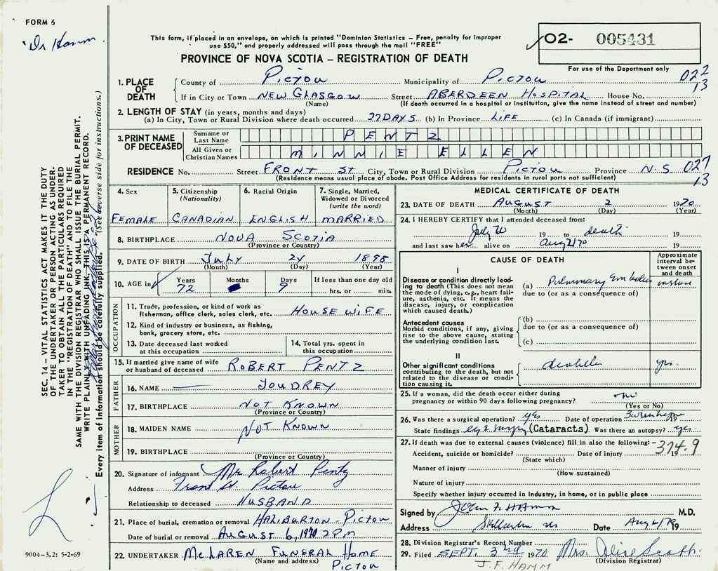 PROVINCE OF NOVA SCOTIA — REGISTRATION OF DEATH