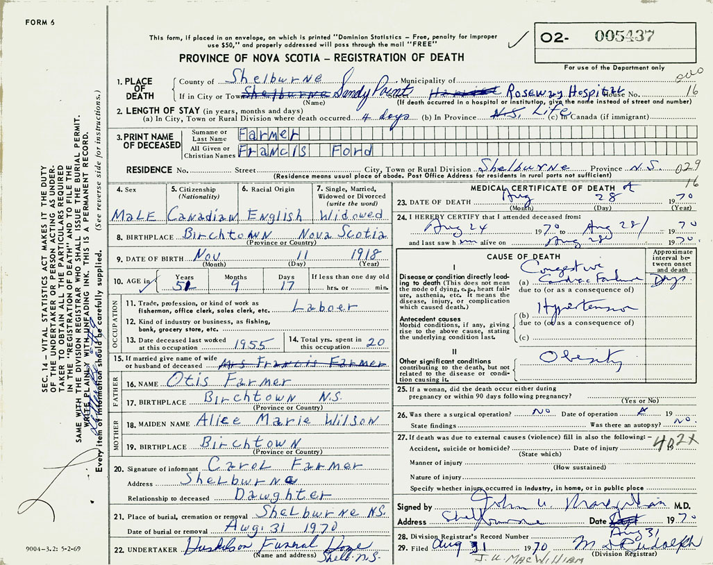 1. PLACE OF DEATH County of Shelburne If in City or Town Sandy Point