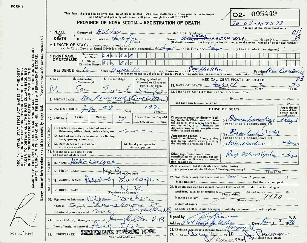 21. Place of burial Campbellton, New Brunswick