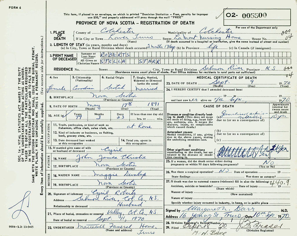 PROVINCE OF NOVA SCOTIA — REGISTRATION OF DEATH