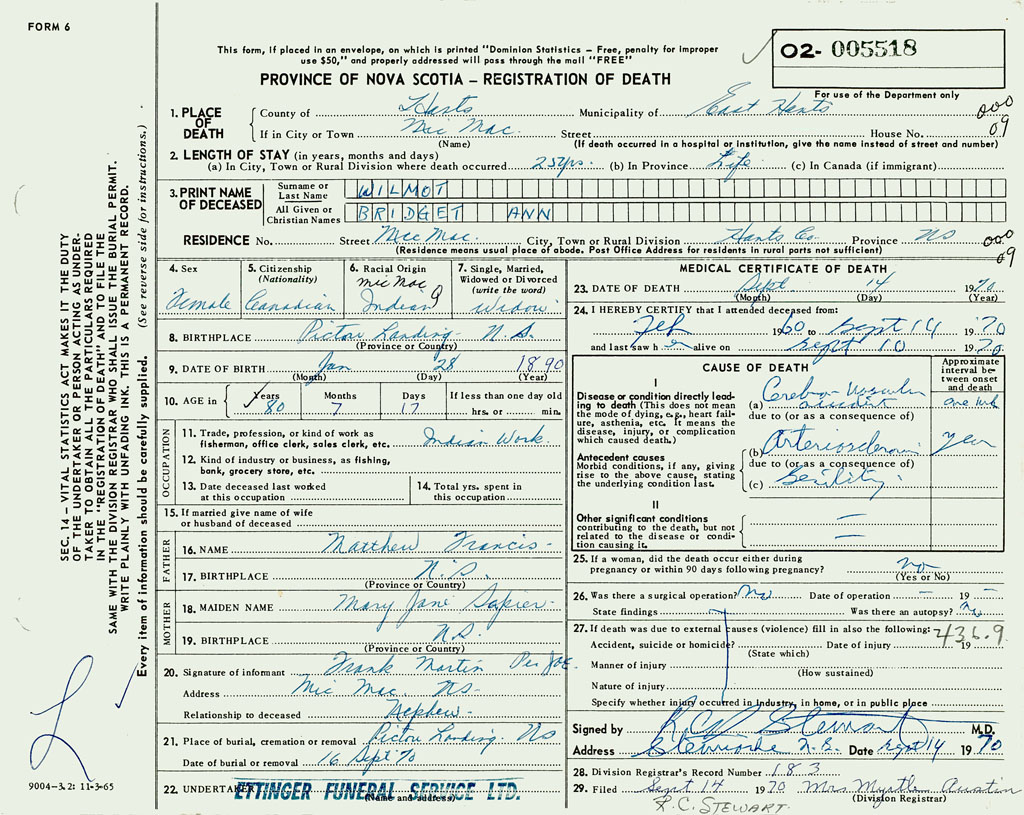 1. PLACE OF DEATH County of Hants If in City or Town Mic Mac