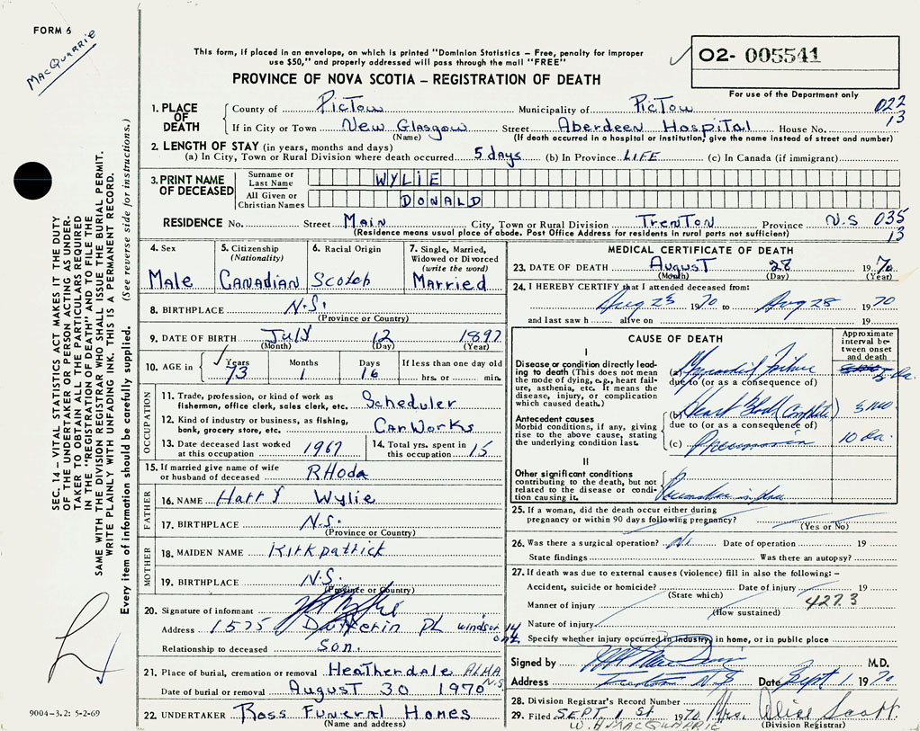 PROVINCE OF NOVA SCOTIA — REGISTRATION OF DEATH