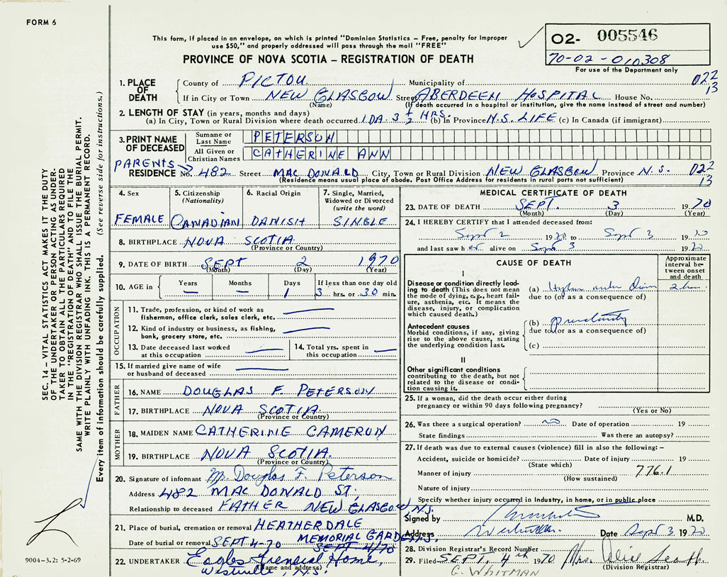 1. PLACE OF DEATH County of Pictou If in City or Town New Glasgow