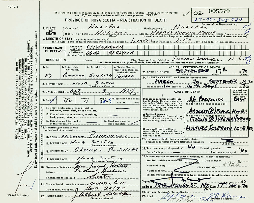PROVINCE OF NOVA SCOTIA — REGISTRATION OF DEATH