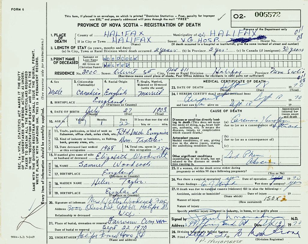 PROVINCE OF NOVA SCOTIA — REGISTRATION OF DEATH