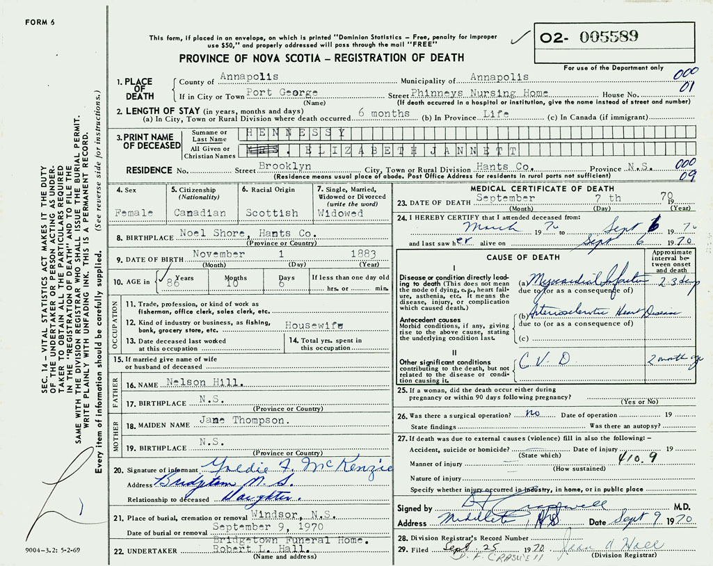 PROVINCE OF NOVA SCOTIA — REGISTRATION OF DEATH