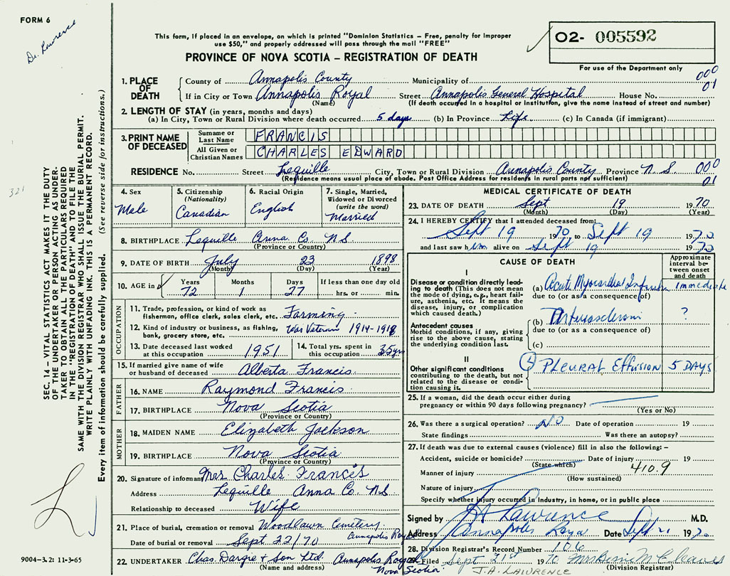 1. PLACE OF DEATH County of Annapolis If in City or Town Annapolis Royal