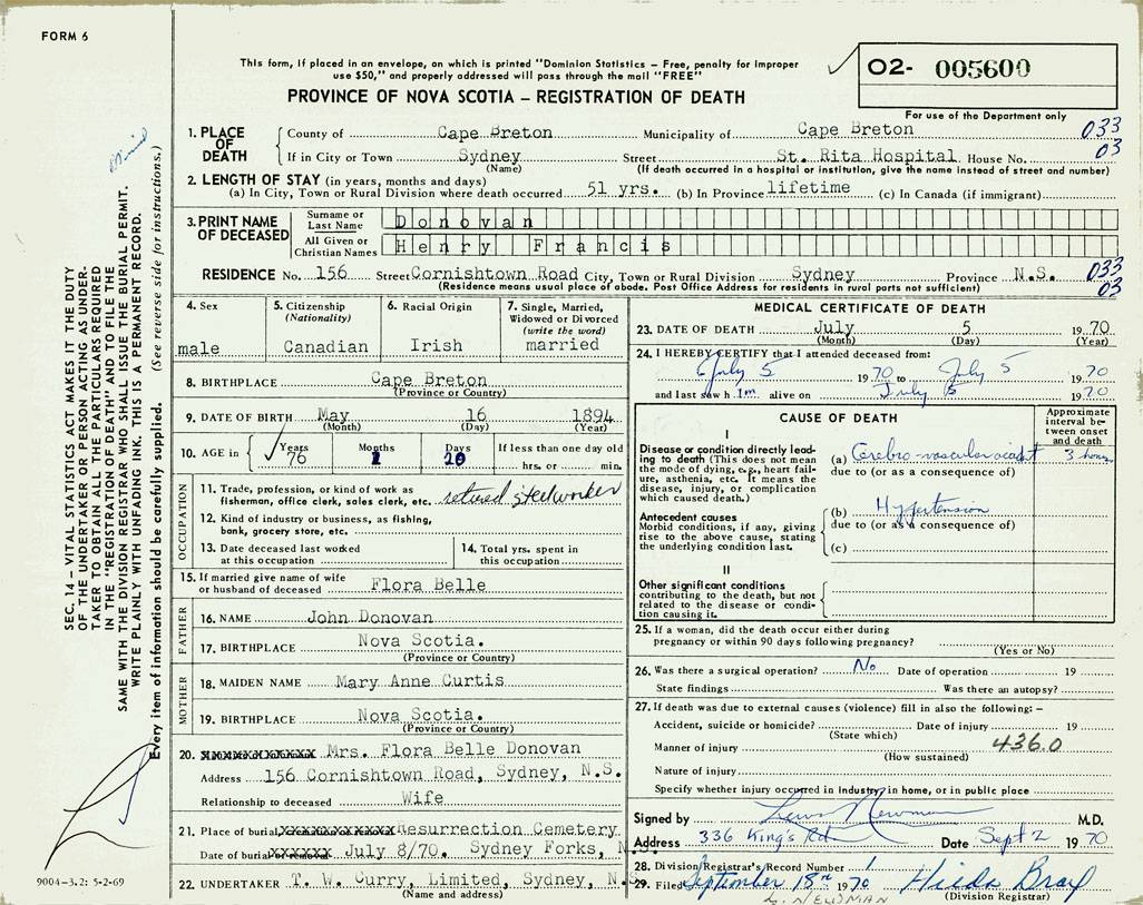 PROVINCE OF NOVA SCOTIA — REGISTRATION OF DEATH