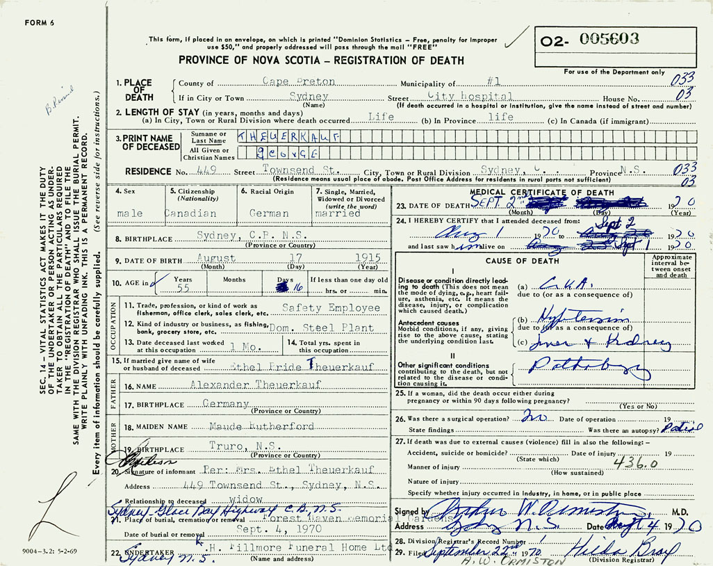 1. PLACE OF DEATH County of Cape Breton If in City or Town Sydney