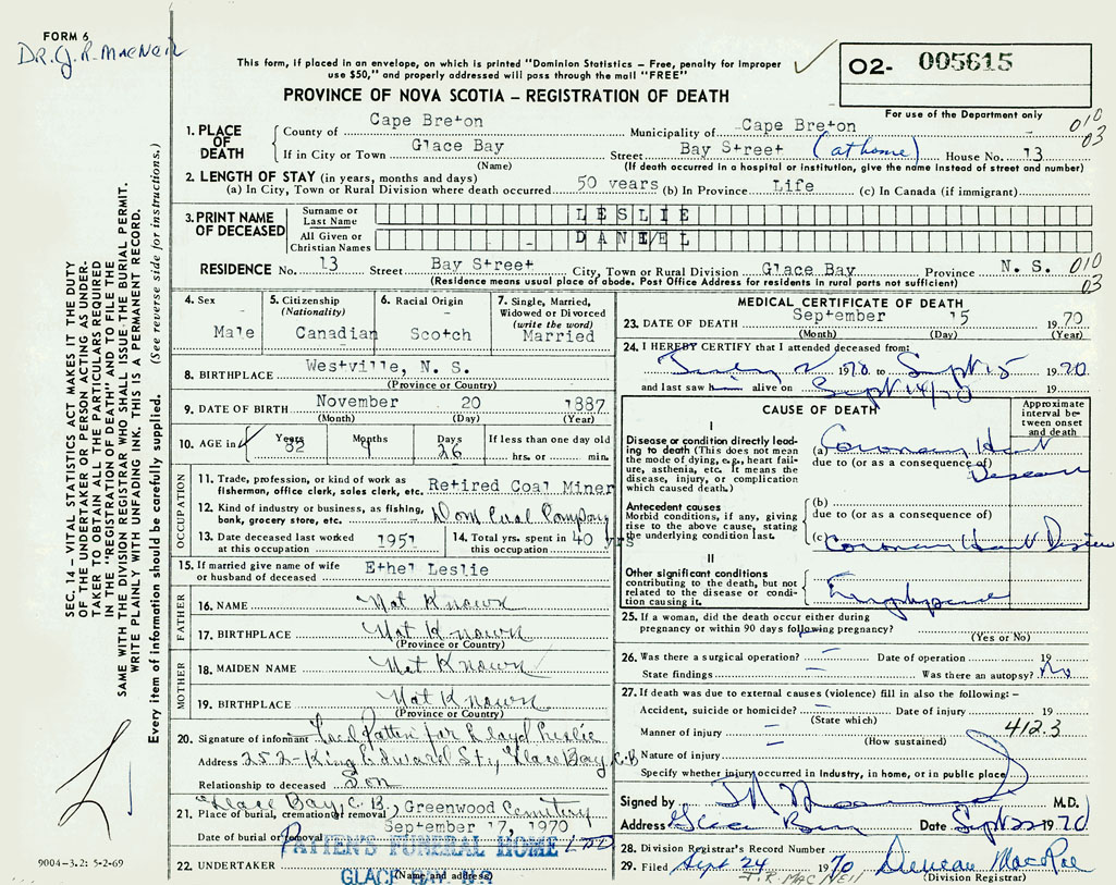 1. PLACE OF DEATH County of Cape Breton If in City or Town Glace Bay