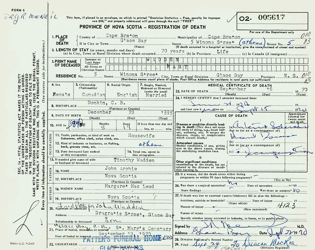 1. PLACE OF DEATH County of Cape Breton If in City or Town Glace Bay