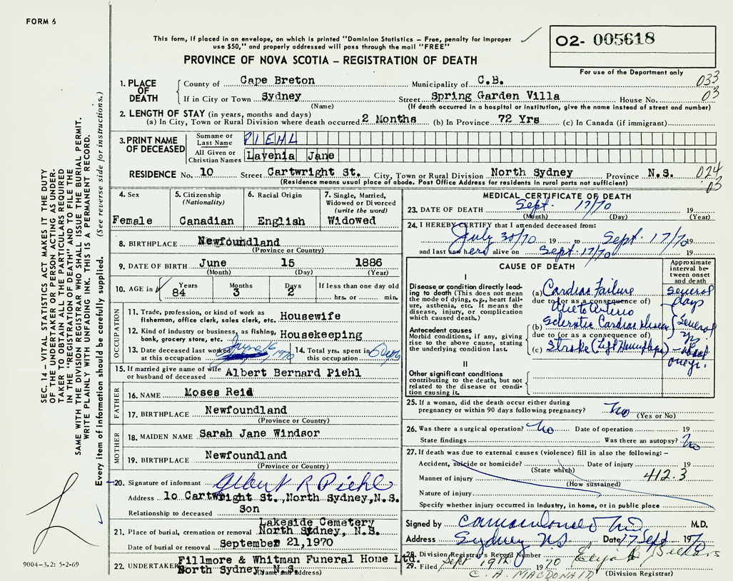 PROVINCE OF NOVA SCOTIA — REGISTRATION OF DEATH