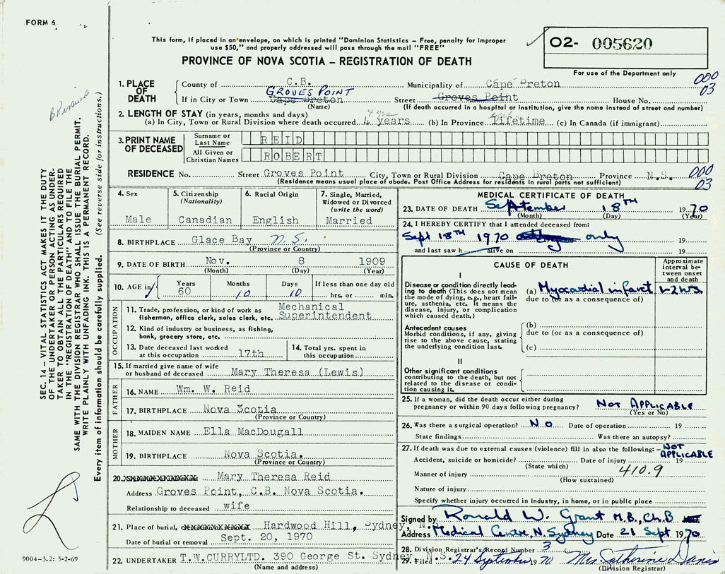 PROVINCE OF NOVA SCOTIA — REGISTRATION OF DEATH