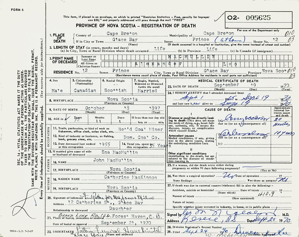 1. PLACE OF DEATH County of Cape Breton If in City or Town Glace Bay