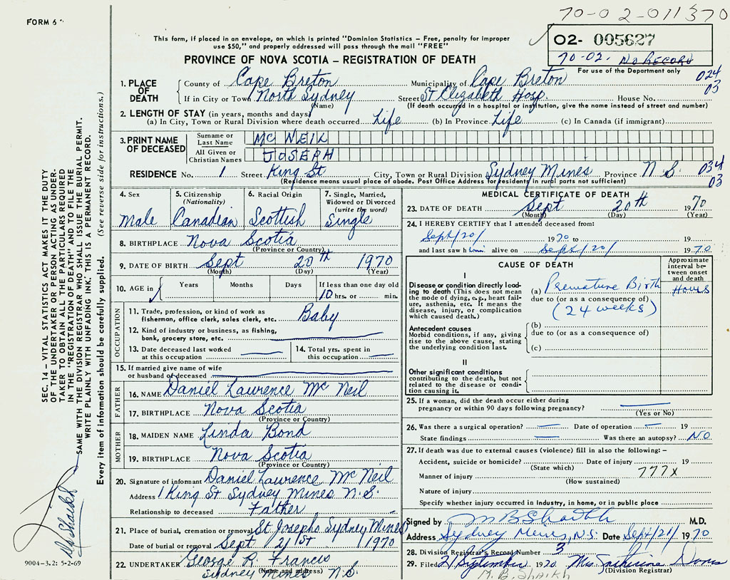 1. PLACE OF DEATH County of Cape Breton If in City or Town North Sydney