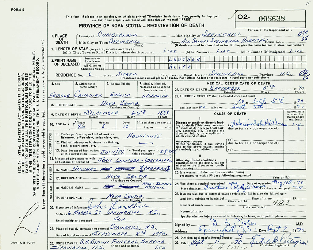 PROVINCE OF NOVA SCOTIA — REGISTRATION OF DEATH