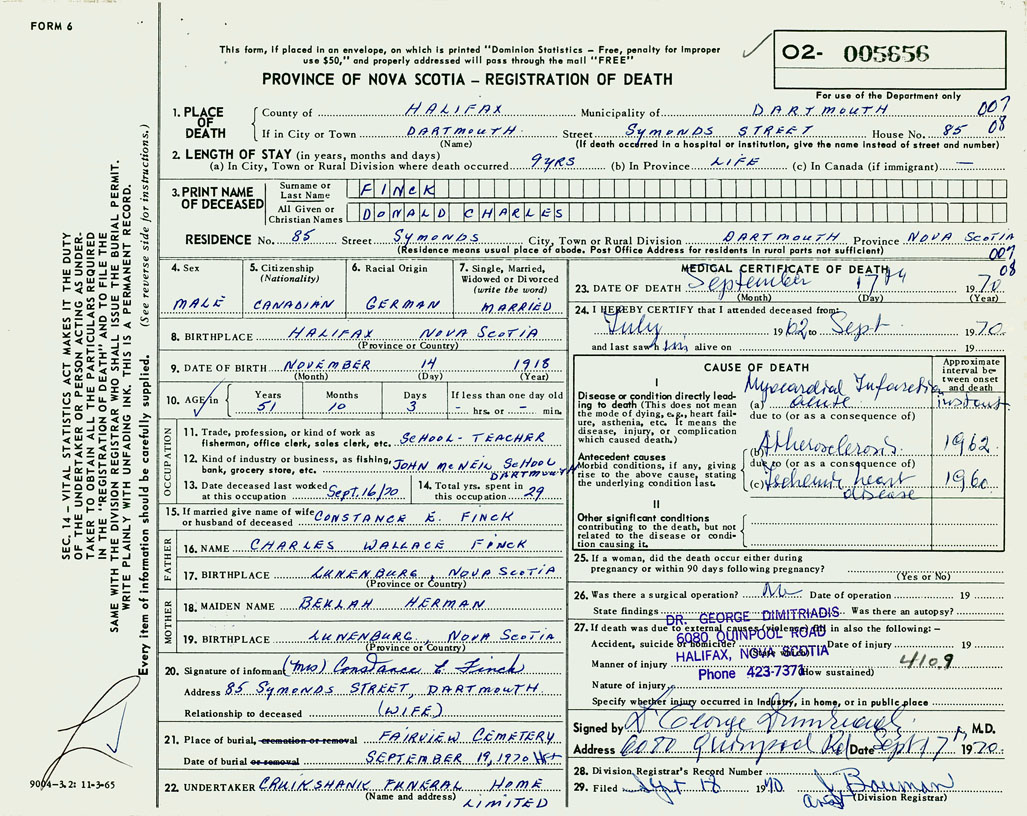 PROVINCE OF NOVA SCOTIA — REGISTRATION OF DEATH