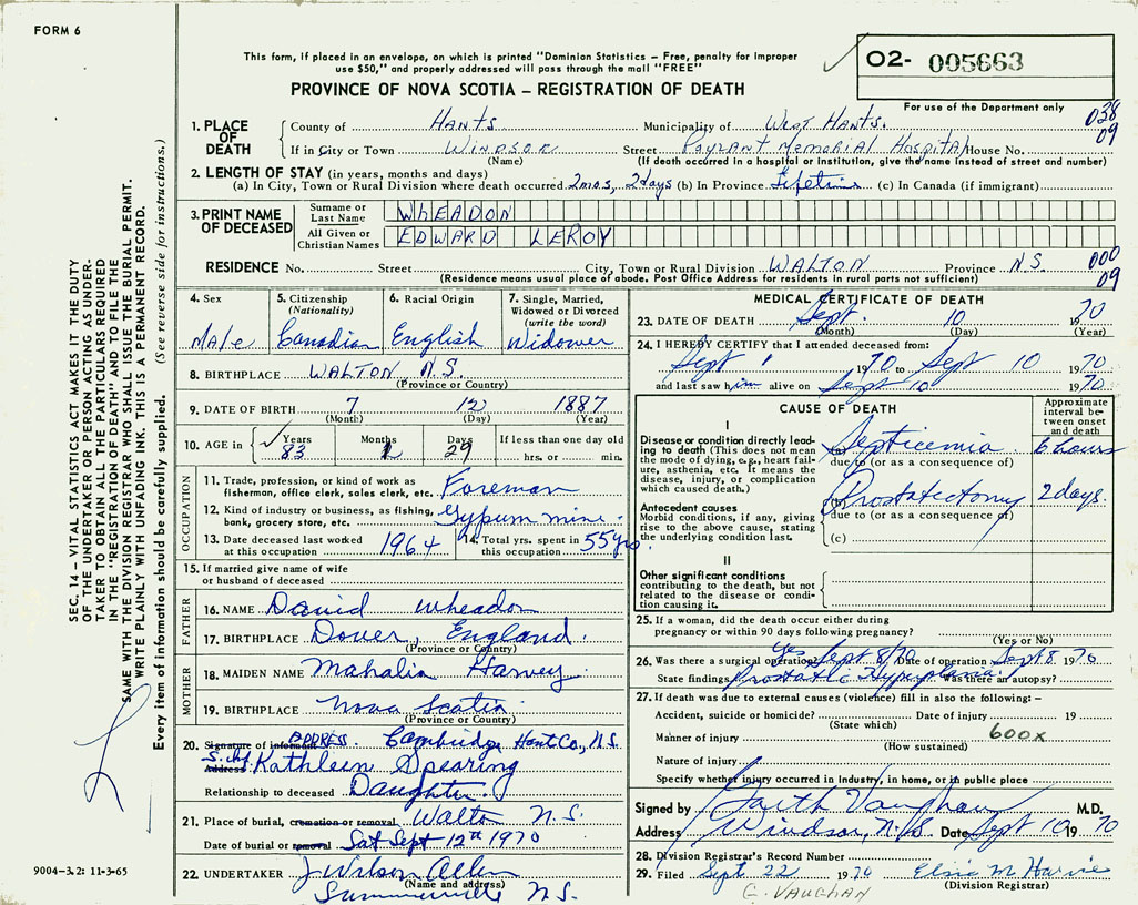 1. PLACE OF DEATH County of Hants If in City or Town Windsor