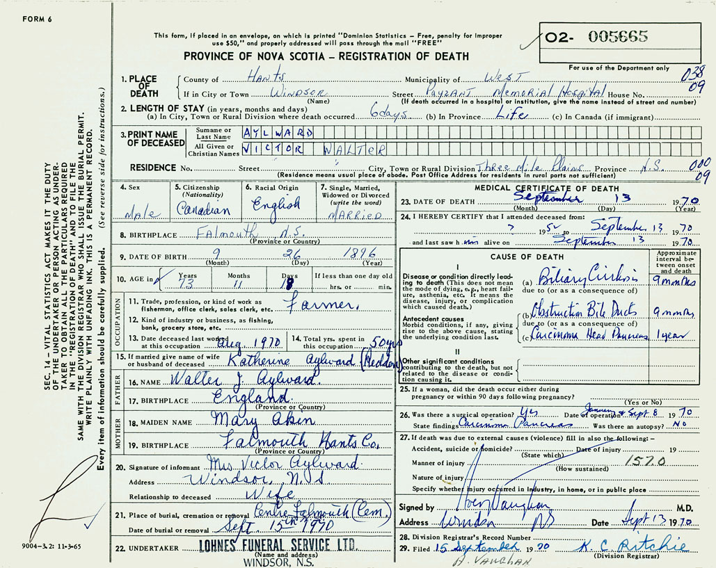 1. PLACE OF DEATH County of Hants If in City or Town Windsor