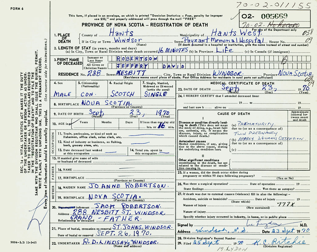 PROVINCE OF NOVA SCOTIA — REGISTRATION OF DEATH