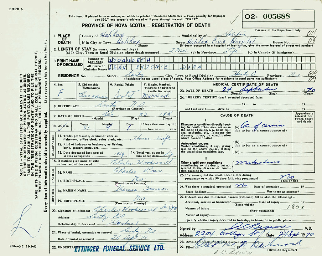 PROVINCE OF NOVA SCOTIA — REGISTRATION OF DEATH