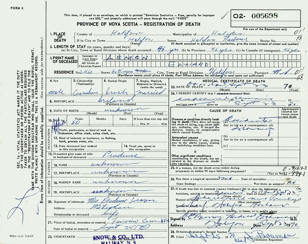 PROVINCE OF NOVA SCOTIA — REGISTRATION OF DEATH