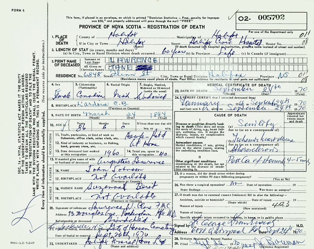PROVINCE OF NOVA SCOTIA — REGISTRATION OF DEATH