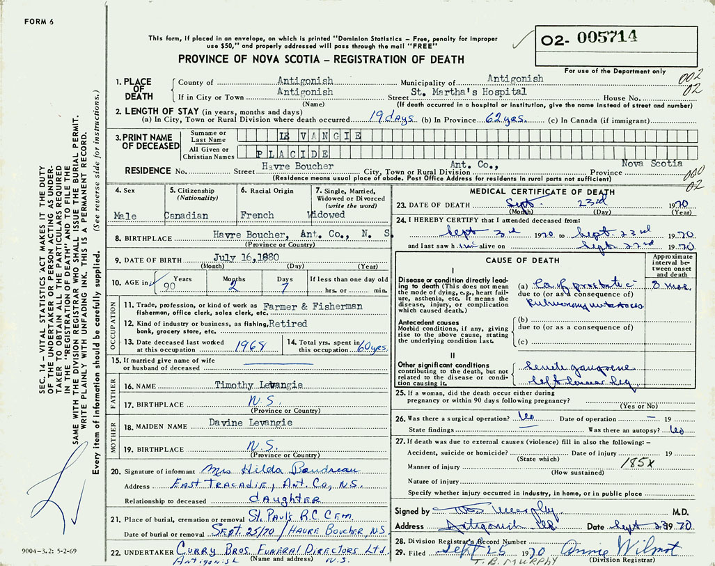PROVINCE OF NOVA SCOTIA — REGISTRATION OF DEATH
